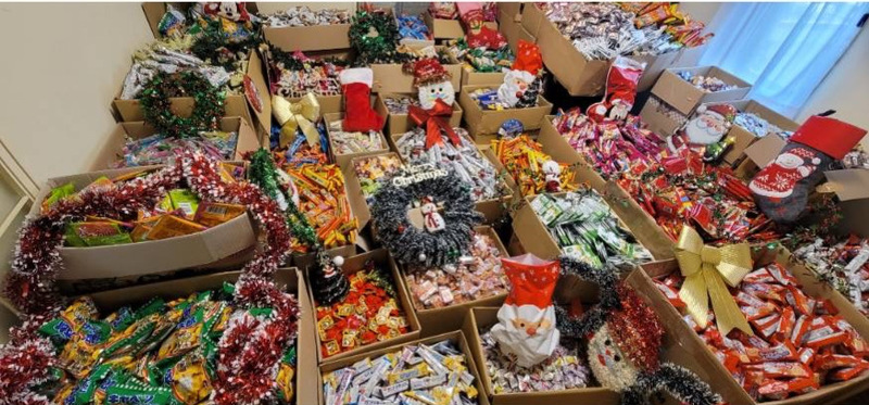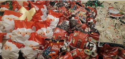 プレゼントのお菓子を大きい袋にいれおわったよ、
